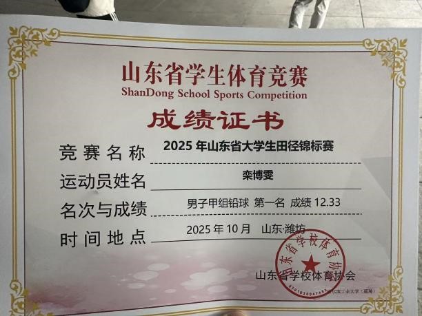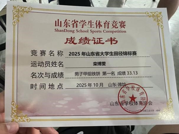 近日,2025年山东省大学生田径锦标赛在潍坊市奥林匹克体育中心圆满落幕。本次赛事共吸引全省68所高校的700余名运动员同台竞技。我校田径队创下史无前例的辉煌战绩,以两枚金牌、两枚银牌、一枚铜牌的优异成绩圆满收官,强势跻身男子甲组奖牌榜第四名及甲组团体奖牌榜前列,以汗水和拼搏书写了校区体育运动的崭新篇章。